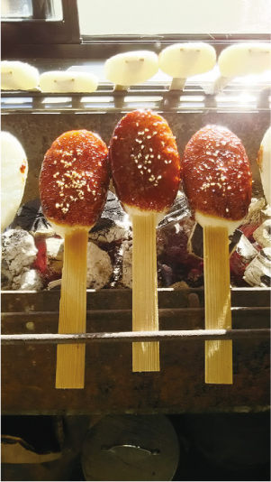 こんがり焼けたみその香がたまらない、手づくりの五平餅。赤みそベースのタレの隠し味はショウガとゴマ。注文を受けてから1本ずつ木炭で焼き上げます。